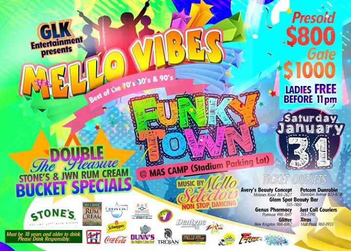 Come MELLO start your new year with GLK Entertainment and Stone’s Ginger Wine at Stone’s MELLO VIBES Best of the 70’s, 80’s & 90’s “Funky Town” on January 31, 2015 @ Mas Camp (Stadium Car Park).