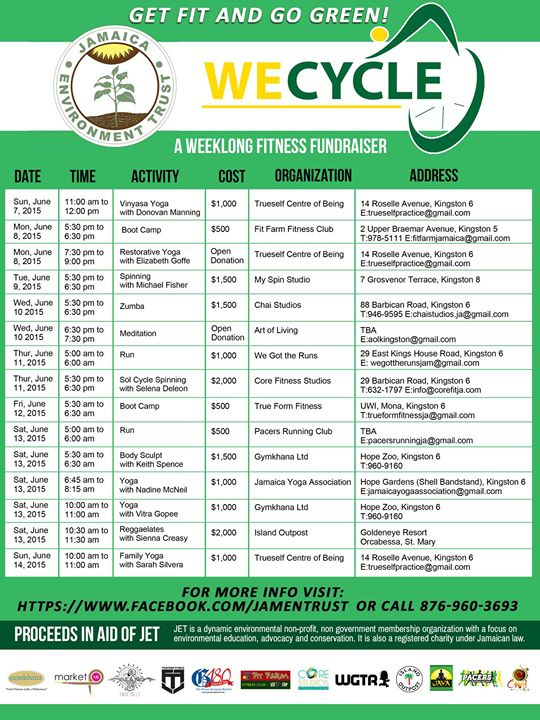 Over the course of the week there will be yoga, running, zumba, boot camp, spinning, football and body sculpt activities as well as a sealed bid auction all in aid of JET. Participating gyms,studios and fitness groups include TrueSelf Centre of Being, Gymkhana Limited, Jamaica Yoga Association (JAYA), My Spin Studio, Football Factory Limited Fit Farm Fitness Club, WGTR, Trueform Fitness, CORE Fitness Studios Jamaica, Chai Studios, Pacers Running Club, Art of Living and Island Outpost