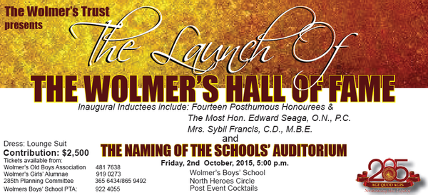 The Wolmer's Hall of Fame and Naming of the School's Auditorium. Inaugural Inductions include: The Most Hon Edward Phillip George Seaga & Sybil Eloise Francis along with Fourteen Honorees. Entertainment: Alumnus, Micheal Sean Harris (Vocalist).