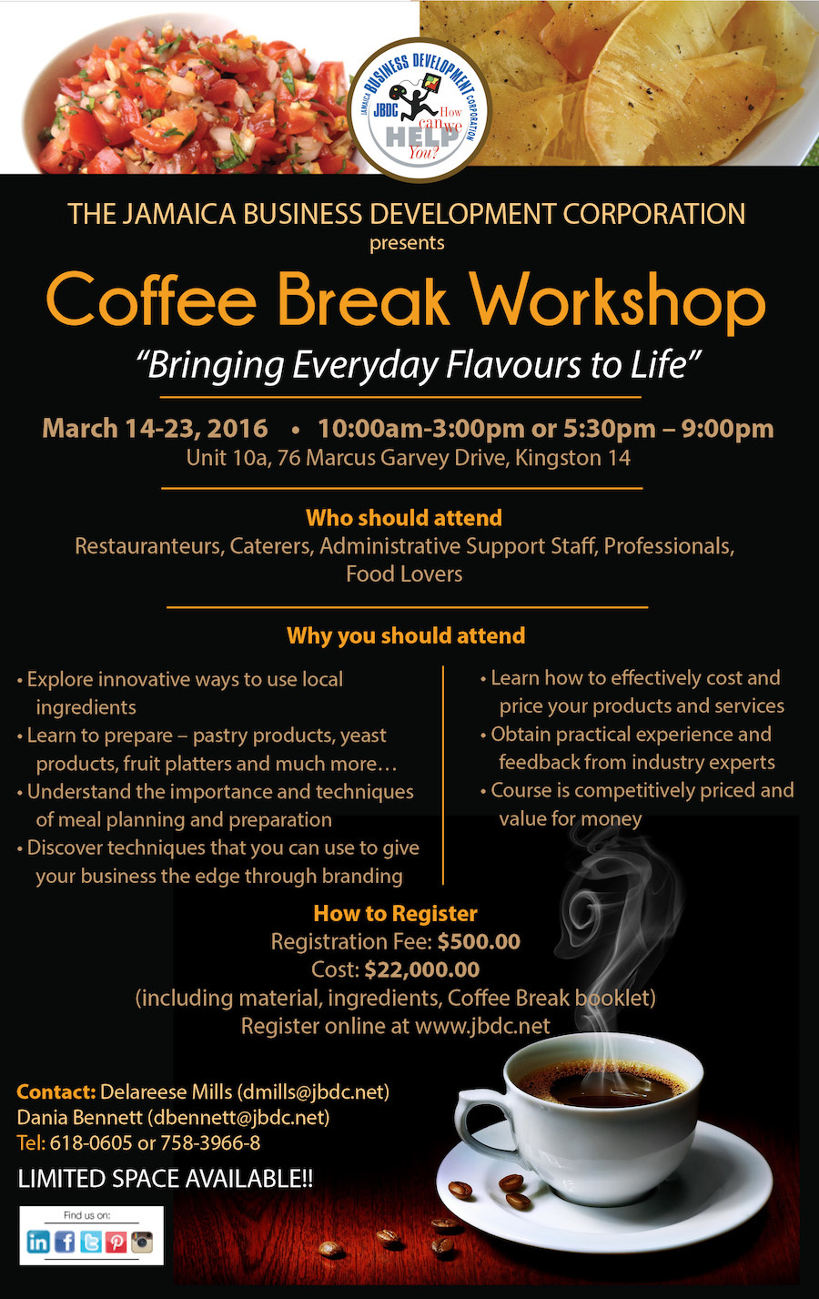 The Jamaica Business Development Corporation (JBDC) will be facilitating a Coffee Break Workshop- “Bringing Everyday Flavours to Life”, on March 14-23, 2016. The workshop will be executed over eight days and will focus on assisting participants to develop local food ingredients into exceptional meal options.