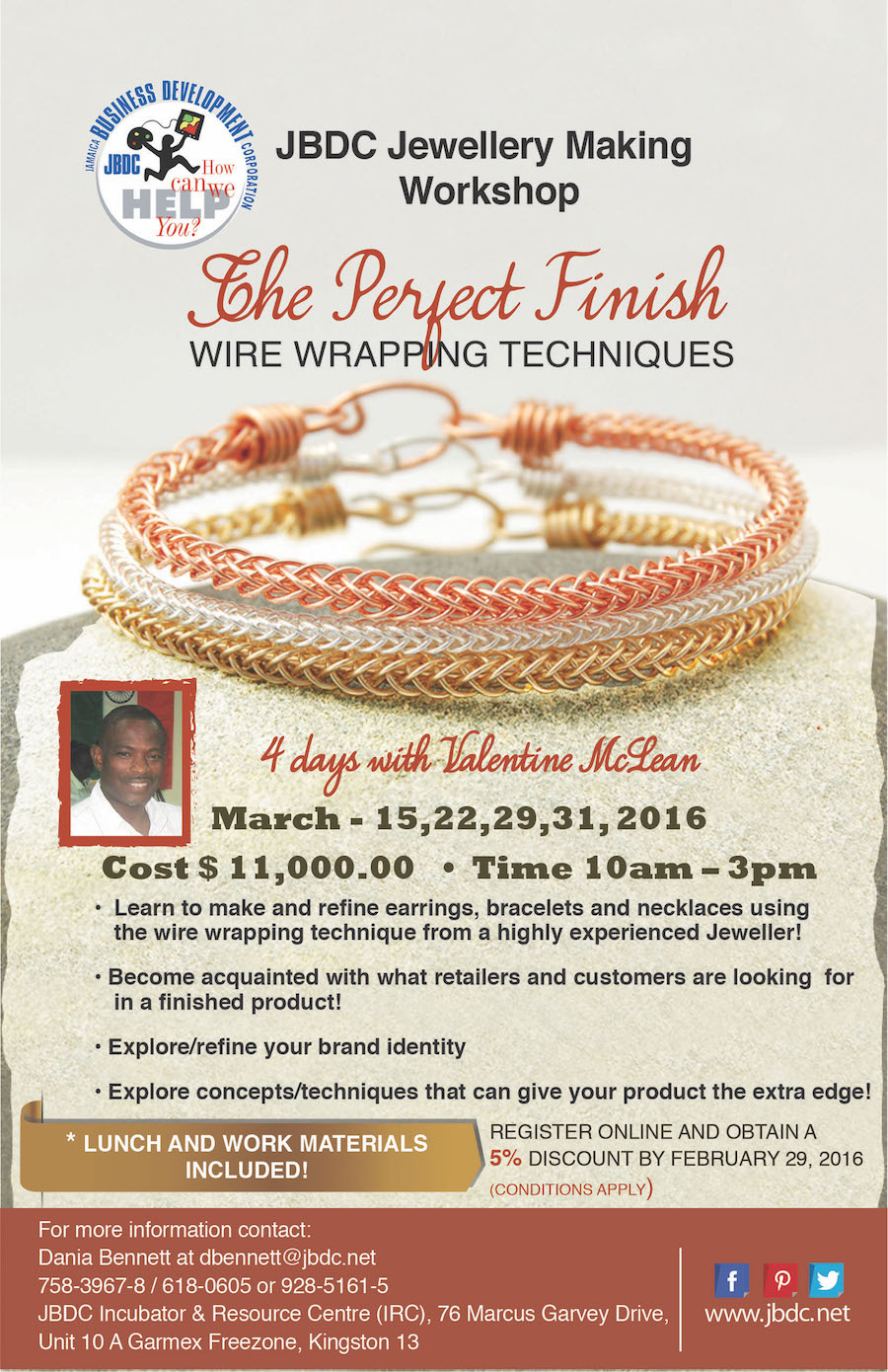 From Concept to Market: The Perfect Finish (Wire Wrapping) Jewellery Workshop is a new workshop that will be implemented by the JBDC’s Incubator and Resource Centre over a four-day period between the hours of 10:00am and 3:00pm on March 15, 22, 29 & 31, 2016.