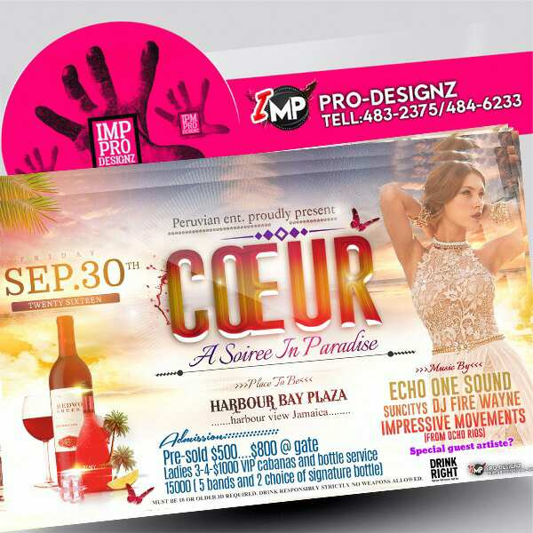 �� Peruvian Entertainment Presents �� 'COEUR- A Soiree In Par;adise' � Venue: Harbour Bay Plaza, Harbour View � Date: September 30,2016 �Music By: Echo One Sound � Dj Fire Wayne Impressive Movements Admission �: $500 Pre-sold; $800 At The Gate � Ladies 3-4-1 $1000 VIP Cabanas And Bottle Service $15000 For 5 Bands And Two Choice Of Signature Bottle �� ���Don't Miss The Opportunity To Party In Paradise ���