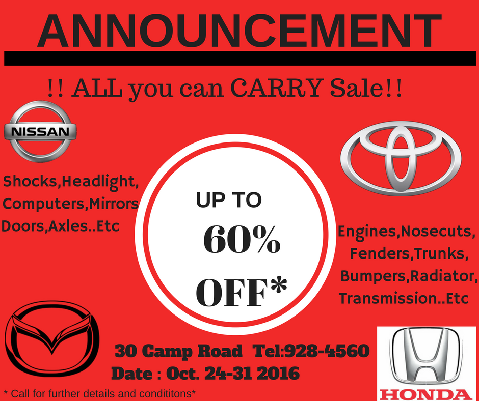 Come and find great deals on all types of used car parts.Look out for our one price all you can carry segments..This will be announced during the sale.