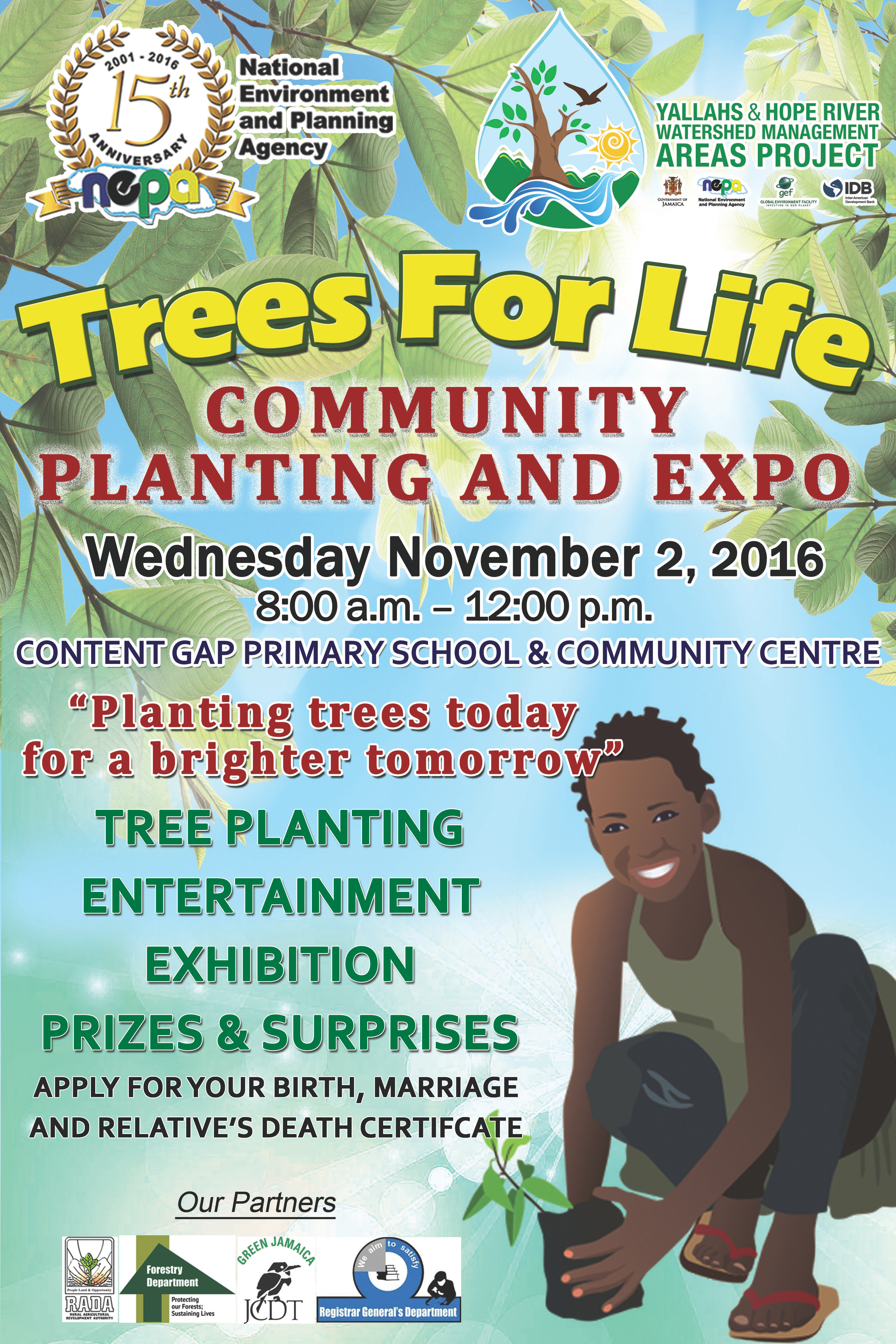 The Integrated Management of the Yallahs and Hope River Watershed Management Areas project, National Environment and Planning Agency is hosting a Special Tree Planting Exercise and Community Exposition. The event will be held at the Content Gap Primary School Wednesday 02 November 2016 beginning at 8:00 a.m. and ends at 12 noon.