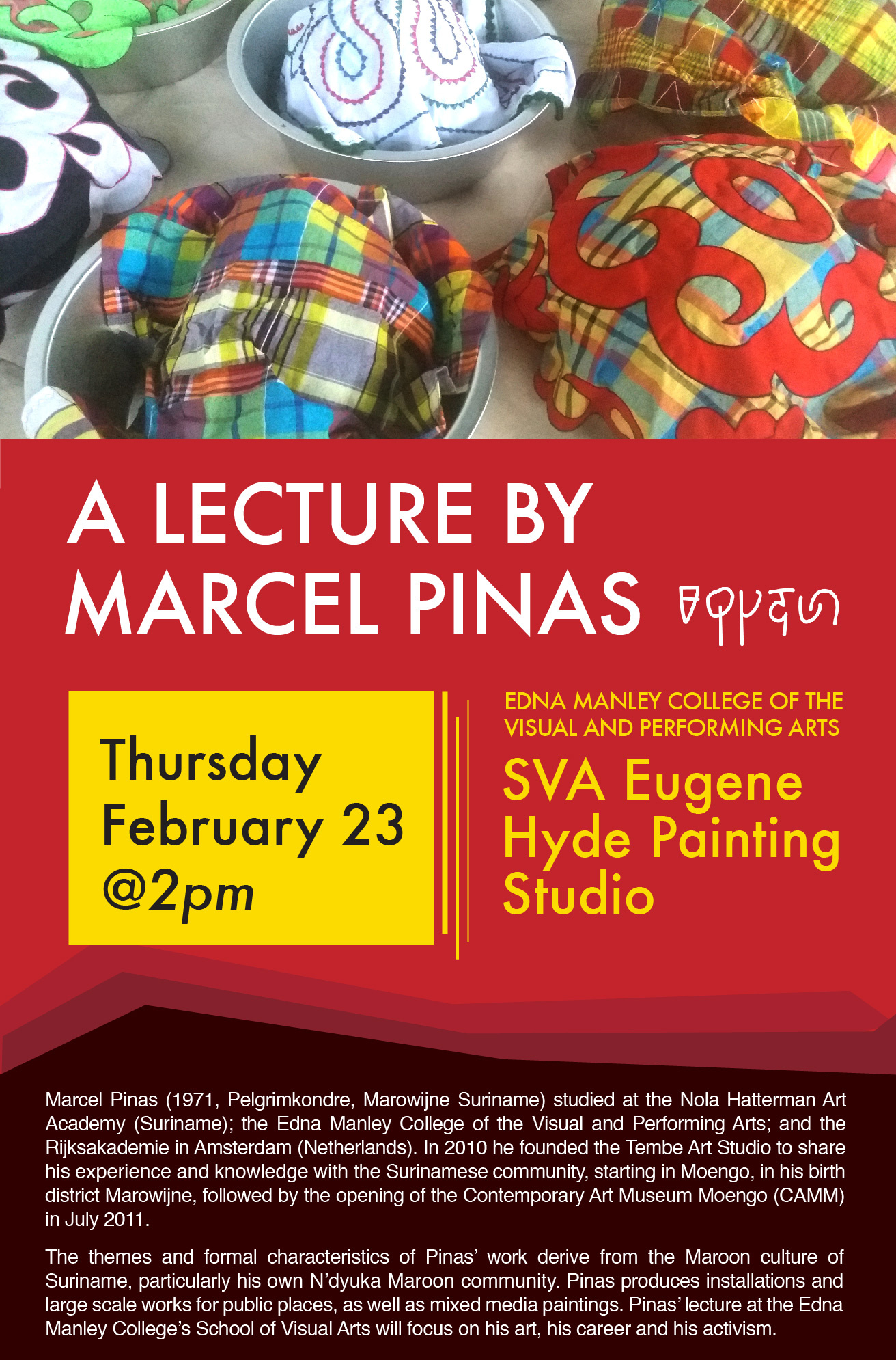 This lecture is a joint presentation of the National Gallery of Jamaica and the Edna Manley College. Marcel Pinas is one of the international invitees in the Jamaica Biennial 2017.