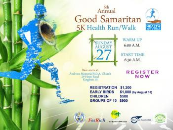 The 6th Annual Good Samaritan 5k Health Run/Walk will be in Kingston on Sunday August 27th 2017 starting at 6:00 am. The race will start at Andrews Memorial SDA Church at 29 Hope Road.