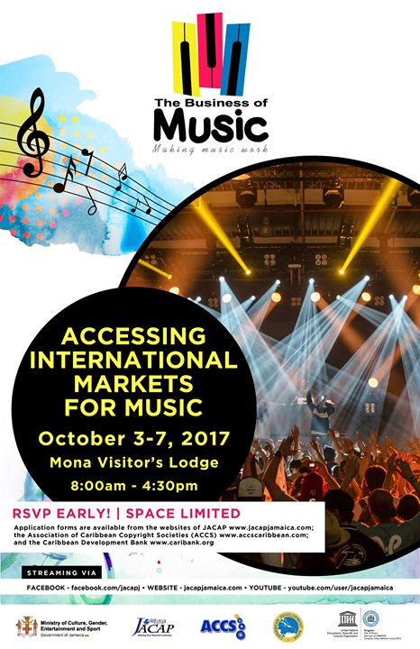 Our final segment of the Business of Music Seminar Series "Accessing International Markets for Music" is schedule to take place on OCTOBER 3 - 7, 2017 at Mona Visitors Lodge. #NewDate #JACAP #WOMEX #Caribank #BOMSeries