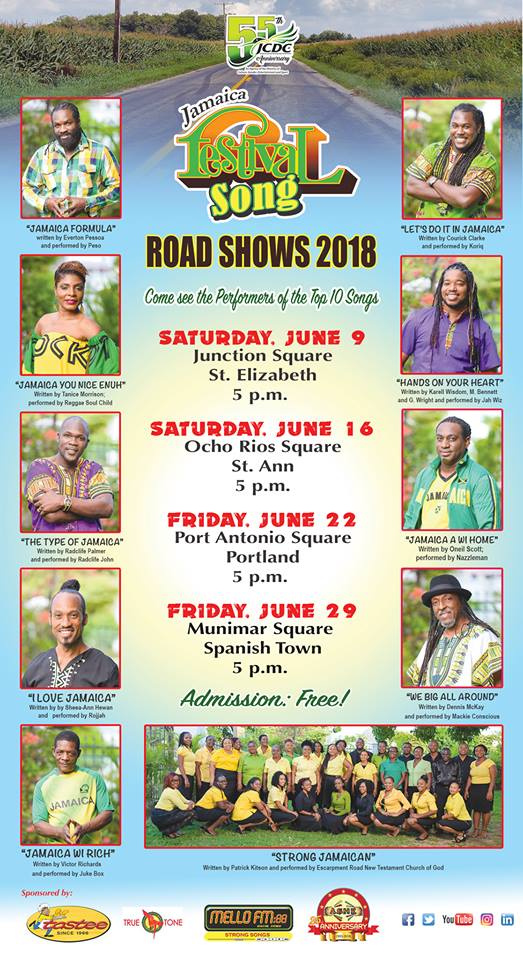 Come to see the performances of the top 10 festival songs; "Jamaica Formula", "Jamaica You Nice Enuh", "The Type of Jamaica", "I love Jamaica", "Jamaica Wi Rich", "Let's Do It in Jamaica", "Hands on Your Heart", "Jamaica A Wi Home" and "We Big All Around".