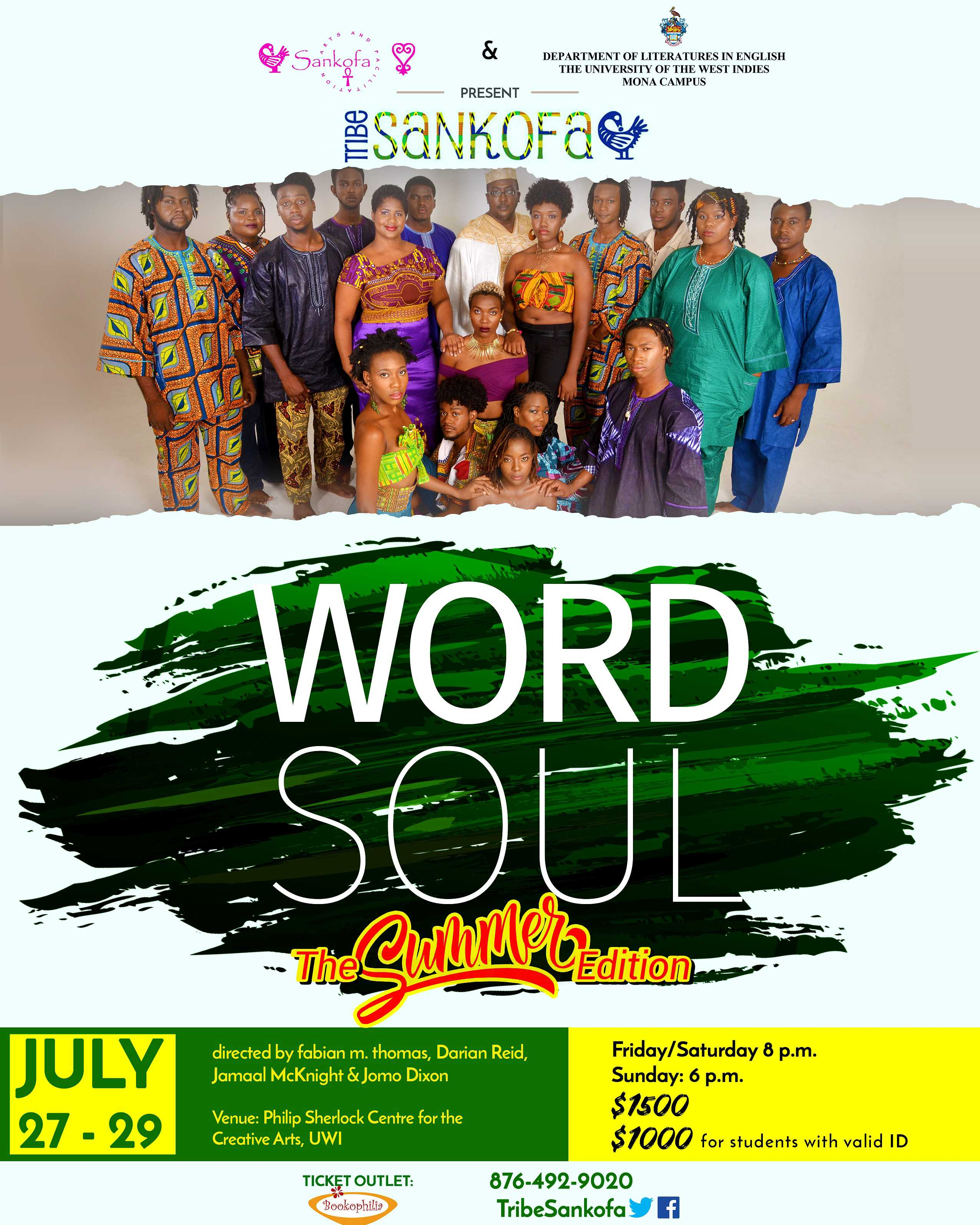 Word Soul, is Tribe Sankofa's signature production, which showcases their niche of combining spoken word/poetry and soulful song-styling uniquely blended with other visual and performing arts.