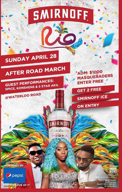 About this eventSmirnoff presents: After road March| Live Performance by Spice, Konshens and 5 Star Akil.