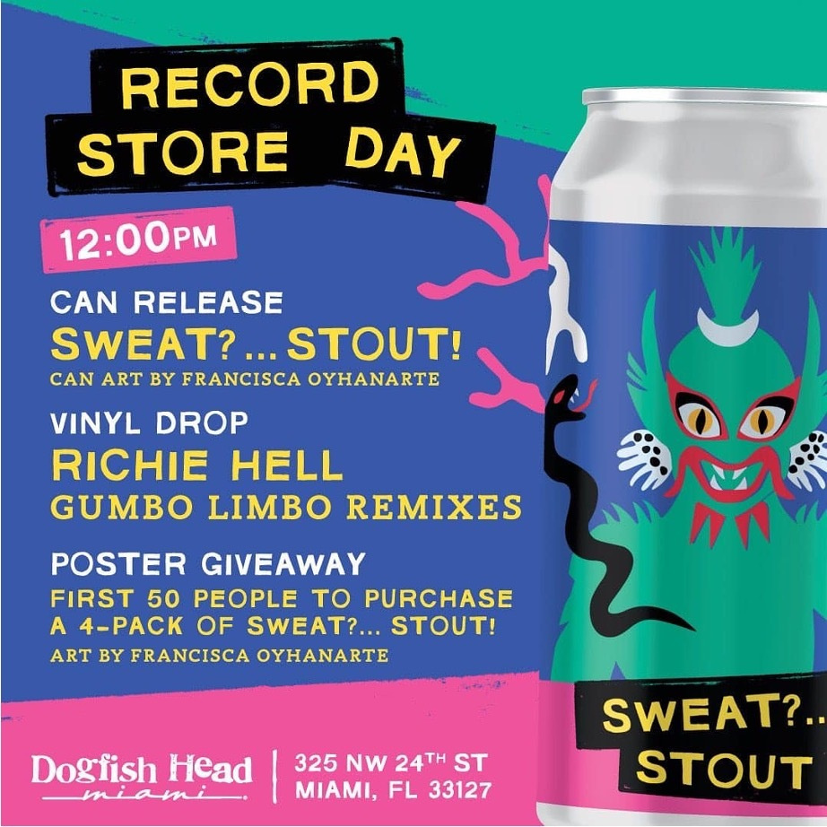 Dogfish Head Miami is partnering with beloved local record store Sweat Records to bring together music, art and beer (of course) for Record Store Day on Saturday, April 23. Festivities will kick off at noon with the launch of a new, Sweat Records-inspired beer, Sweat?...Stout! and the vinyl release of Richie Hell's Gumbo Limbo Remixes.