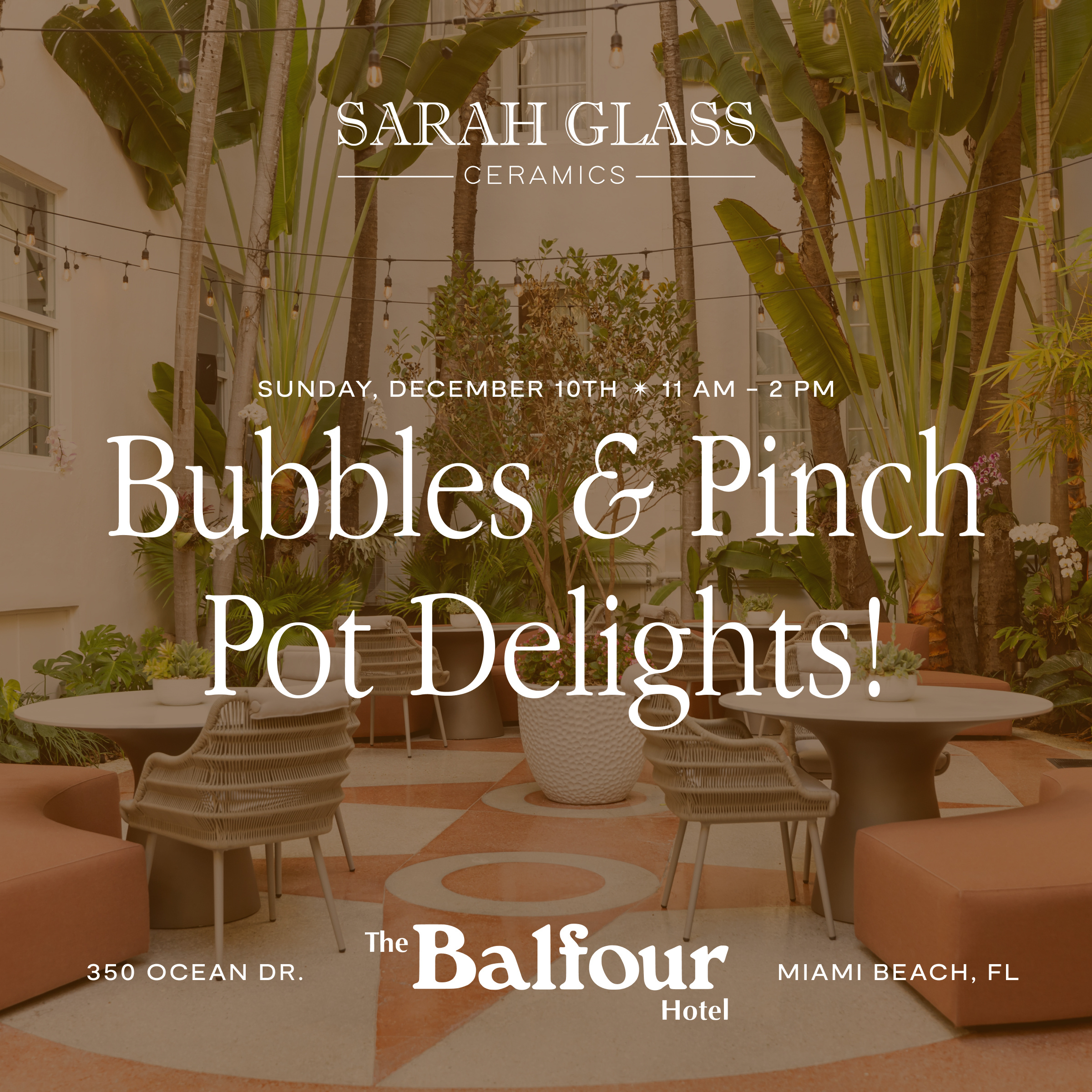 Close out Miami Art Week 2023 with Sarah Glass Ceramics by making clay pinch pots at The Balfour Hotel in Miami Beach on December 10 from 11:00 a.m. to 2:00 p.m.