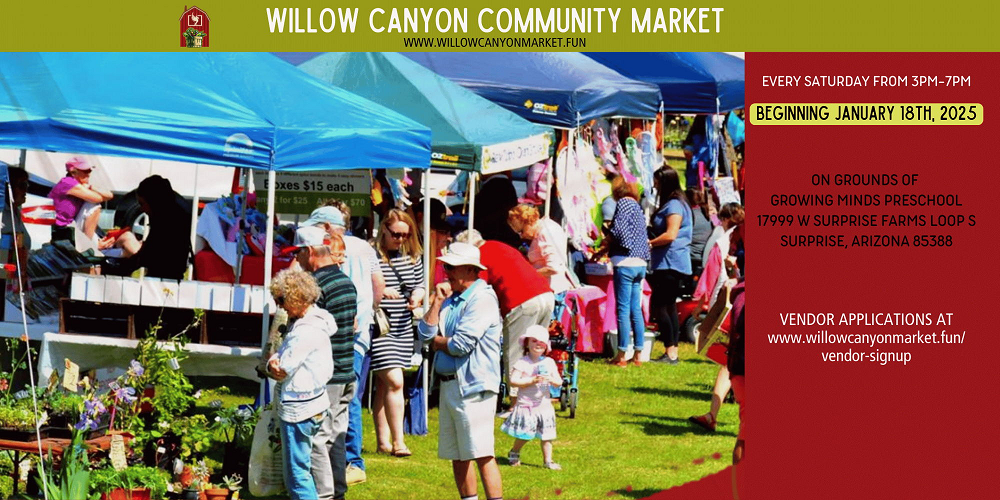 Bring the entire family out to enjoy the Willow Canyon Community Market every Saturday, beginning January 18, 2025, from 3pm-7pm on the grounds of Growing Minds Preschool in Surprise, Arizona.