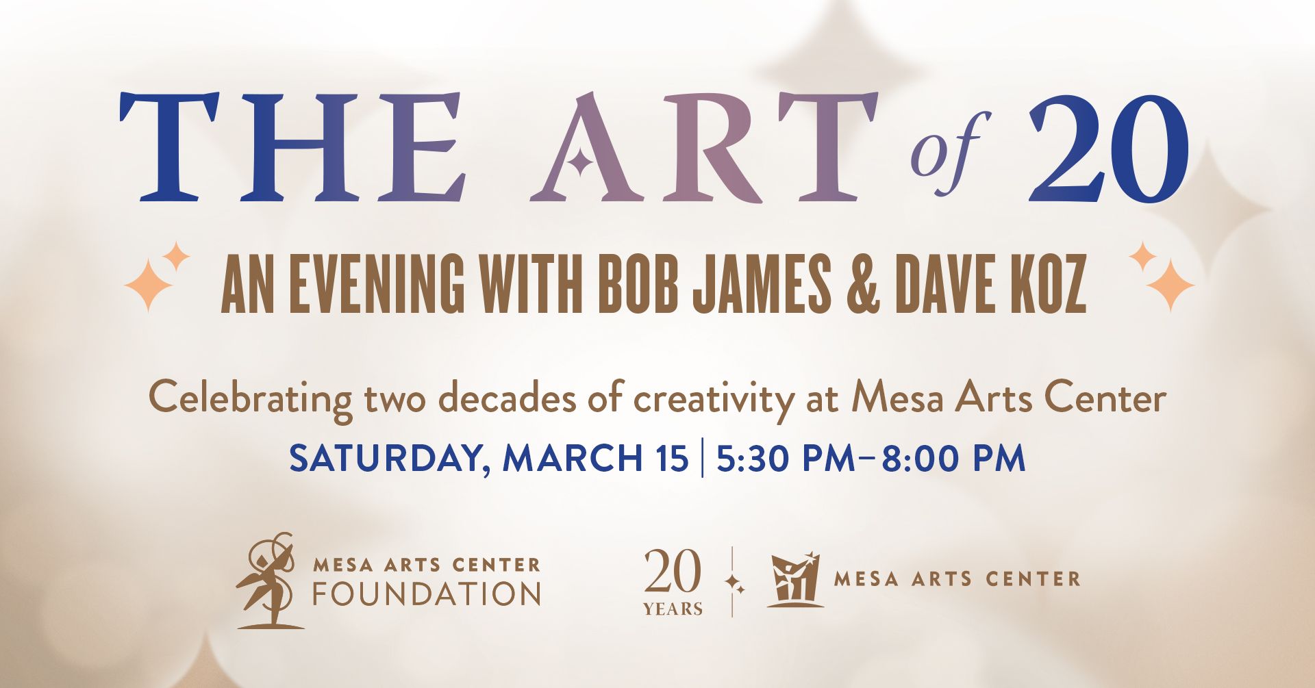 Please join us for Mesa Arts Center Foundation's Annual Gala, "The Art of 20: Celebrating Two Decades of Creativity" featuring celebrated jazz artists, Bob James & Dave Koz, in concert. This special fundraising event provides the critical support to continue education and access programs at Mesa Arts Center. Patrons with a $500 ticket will enjoy a pre-show private reception with cocktails, delicious appetizers and a special visit with Bob James & Dave Koz. After the reception, enjoy prime seats to Just Us: Bob James & Dave Koz in the Piper Theater. Join us after the show for post-show drinks in our theater lobby.