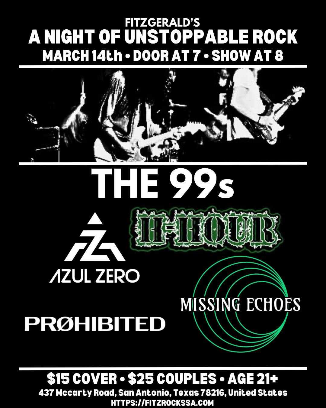 Come join us at Fitzgerald's Bar & Live Music Venue for a night filled with electrifying performances from PRØHIBITED, Missing Echoes, Azul Zero, H-HOUR and The 99s!