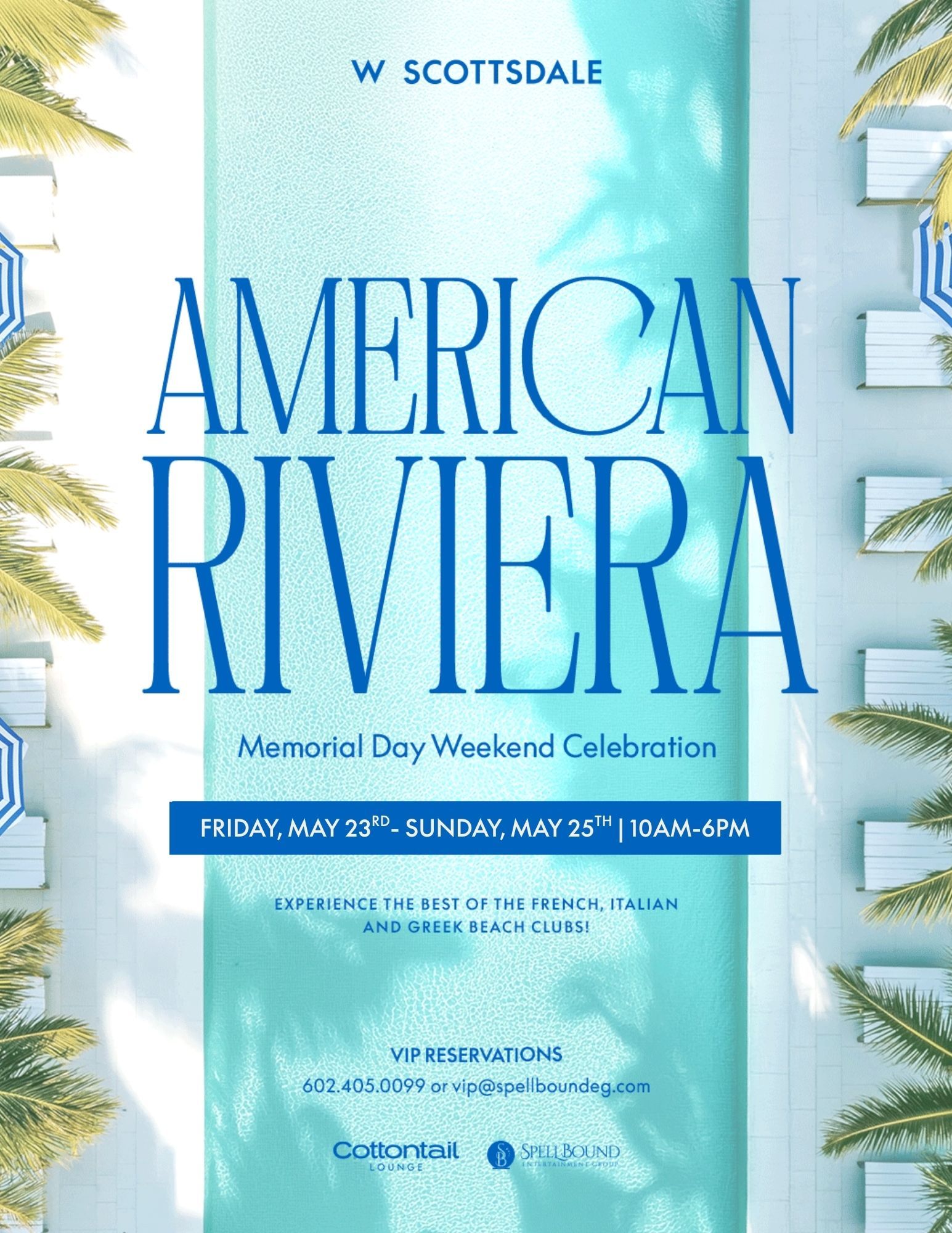 Join us as we celebrate Memorial Day weekend where luxury meets all-American spirit. Experience the best of the French, Italian and Greek beach clubs right in the heart of Scottsdale. Join us from Friday- Sunday from 10AM-6PM as we make a splash with pulsating music, bottle service and the ultimate party vibe. Expect a crowd, seating is limited and books fast. Book your VIP table or cabana by texting 602.405.0099 or email vip@spellboundeg.com [vip@spellboundeg.com].