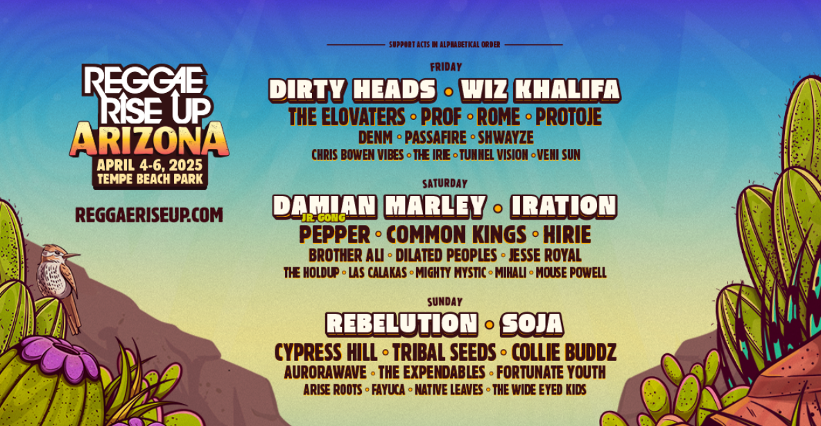 Get ready to feel the heat at Reggae Rise Up Arizona, taking place at the picturesque Tempe Beach Park! Set against the backdrop of the picturesque Salt River, RRU Arizona will feature a mix of top touring reggae and hip-hop talent across two stages. With Phoenix and Scottsdale each just a 15-minute drive away, there’s an abundance of options in accommodations, restaurants, and off-site activities – making it an ideal setting for a weekend-long celebration of amazing people, positive vibes and incredible music!