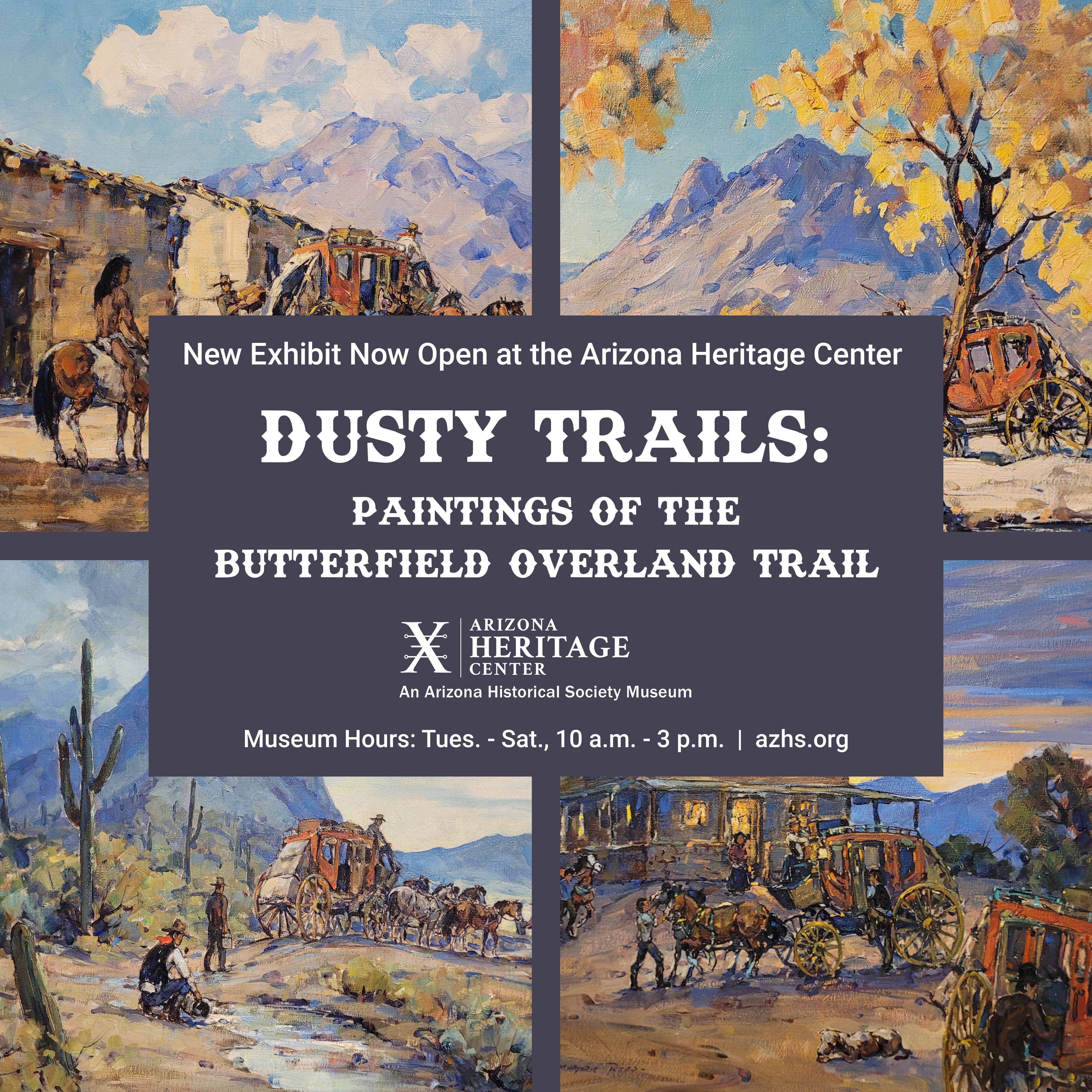We have a new exhibit at the Arizona Heritage Center you won't want to miss! Check out "Dusty Trails: Paintings of the Butterfield Overland Trail" at the AZ Heritage Center, open Tuesday through Saturday, from 10 a.m. - 3 p.m.