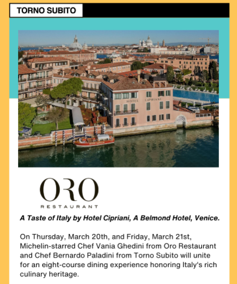 Join Torno Subito Miami, the first U.S. venture by Michelin-starred chef Massimo Bottura, for an exclusive two-night collaboration dinner “A Taste of Italy” with Venice’s Oro by Hotel Cipriani, a Belmond Hotel.