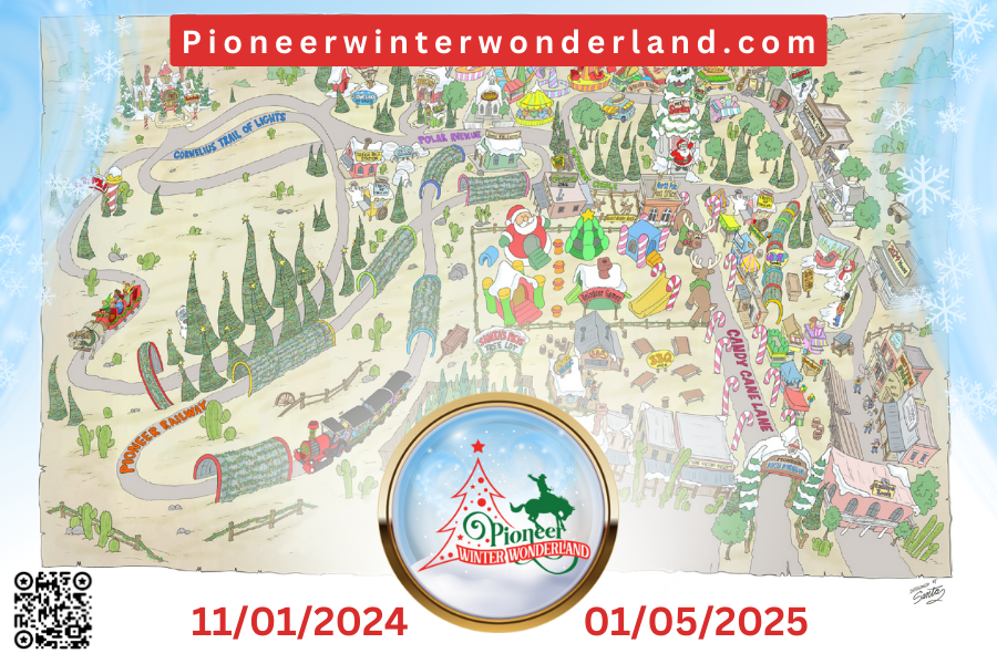 Step into a world of holiday magic at Pioneer Winter Wonderland, Arizona’s premier Christmas event spanning an incredible 90 acres of festive fun! With free parking, delicious food, and endless entertainment, this immersive holiday experience transforms Pioneer Village into a sparkling winter wonderland like no other. Nestled in the heart of the desert, this massive event features live cowboy shows, enchanting light displays, carnival rides, and entertainment for the whole family.
